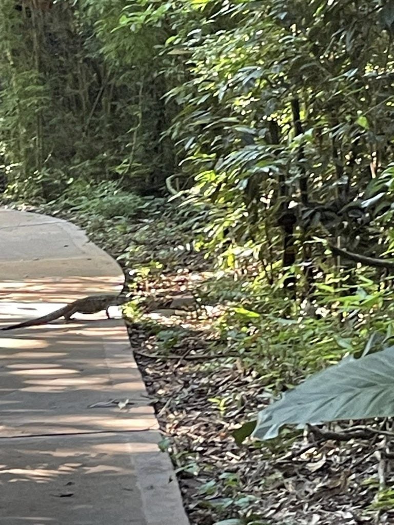 Antes de encontrar mi habitación, me tropecé con la piscina -camino equivocado-, atravesé un puentecillo a lo Indiana Jones, me crucé con tres gatos y un animal indiferente a mi persona descendiente directo de algún reptil antediluviano.