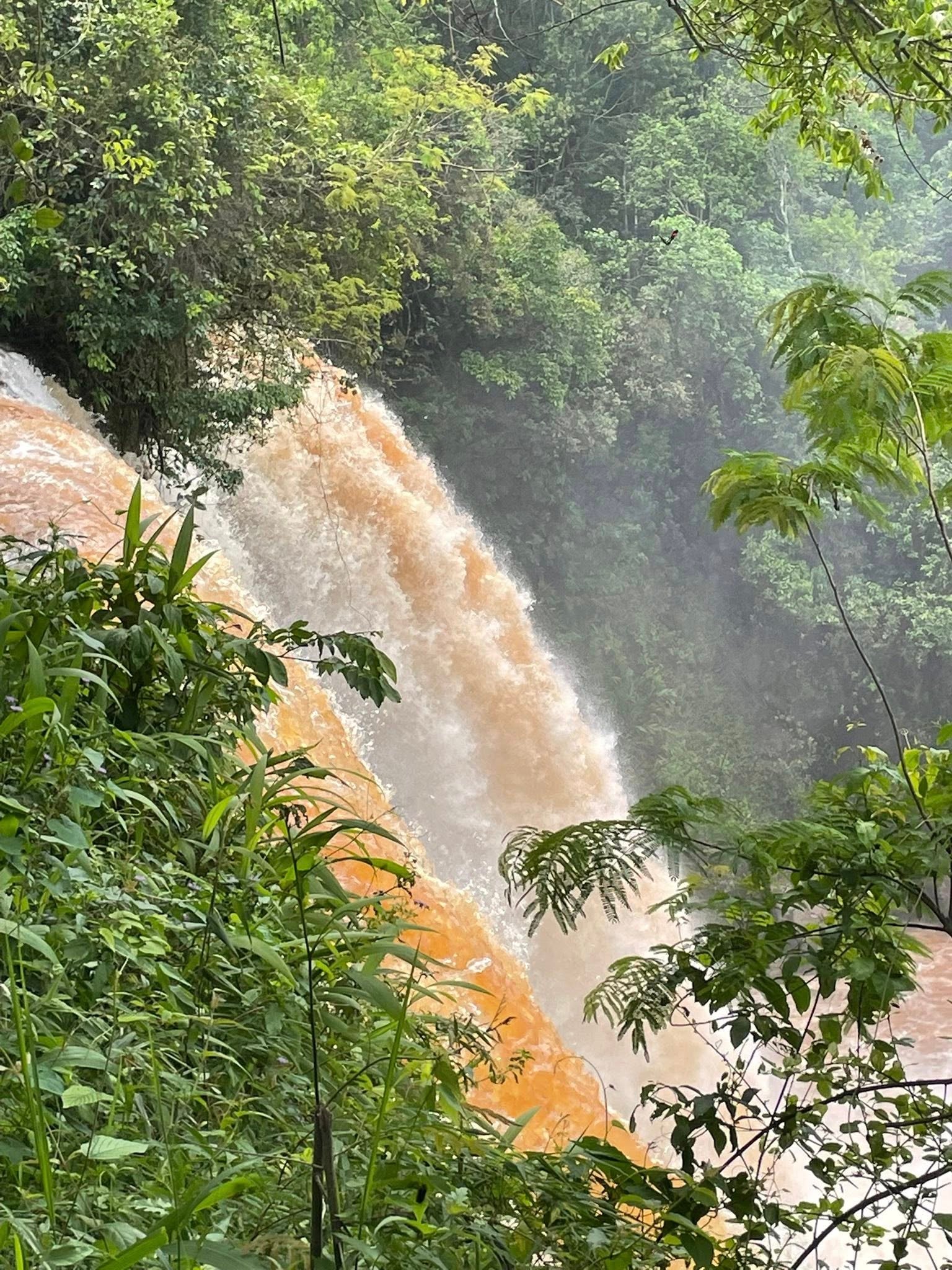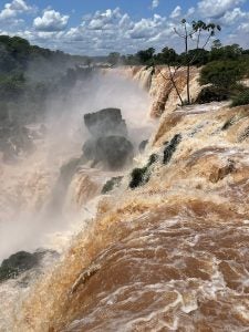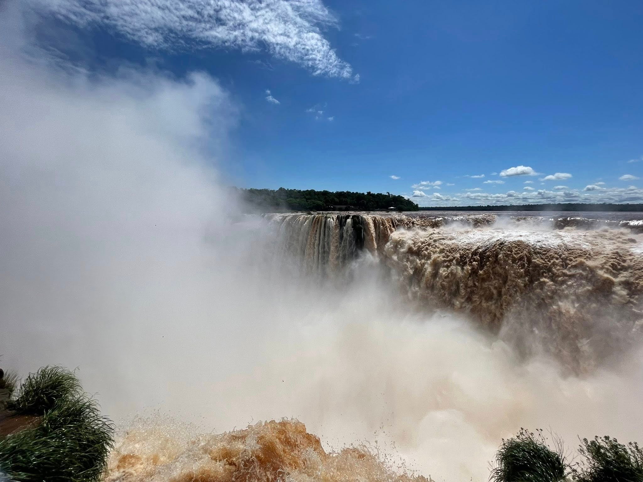 Ya estoy en medio de una aglomeración -con lo que a mí me gustan -; ya estamos miles de turistas, empujándonos a codazos- sorry, please, !Que me dejes sitio!- correteando como pingüinos por las pasarelas que circundan las cataratas con el agua más rojiza del mundo.