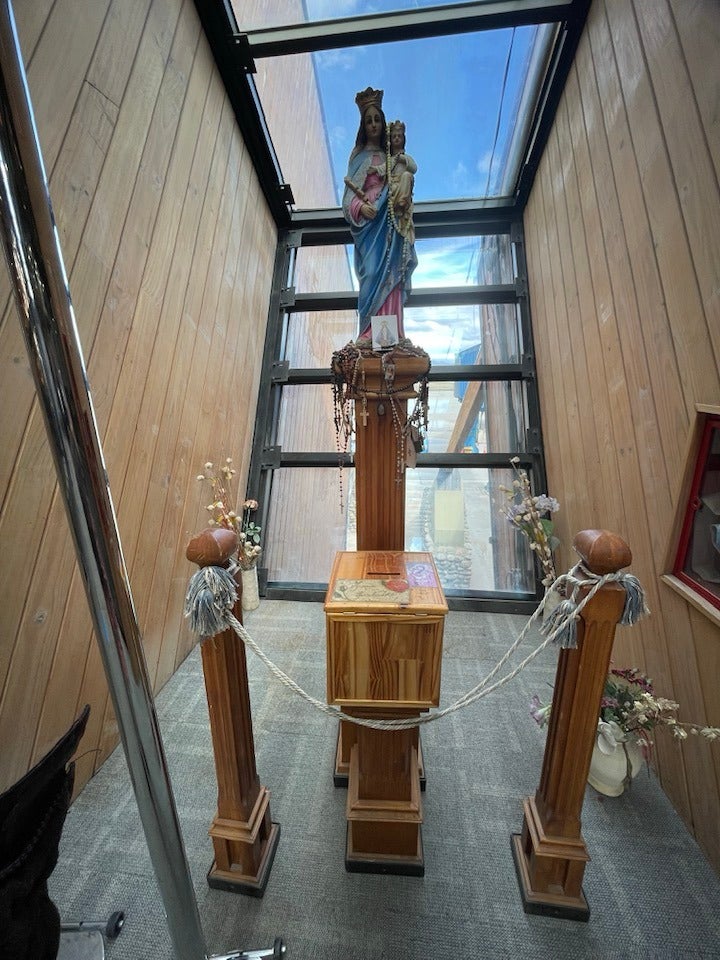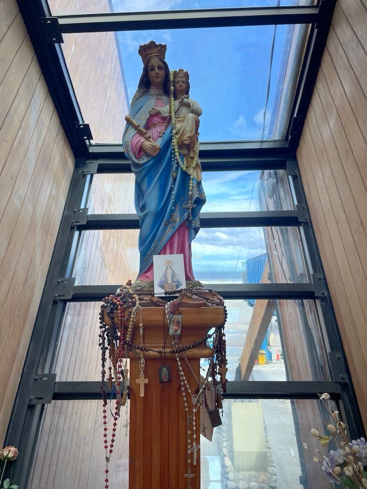 Aeropuerto de El Calafate. Instalación permanente junto a la sala de embarque. Una virgencita cargadita de rosarios y demás parafernalia para que le reces para que quien pilote la nave no padezca un ictus en pleno vuelo. La gente cree en estas cosas…y en muchísimas otras, como que un conejito de peluche les proteja de todo mal.