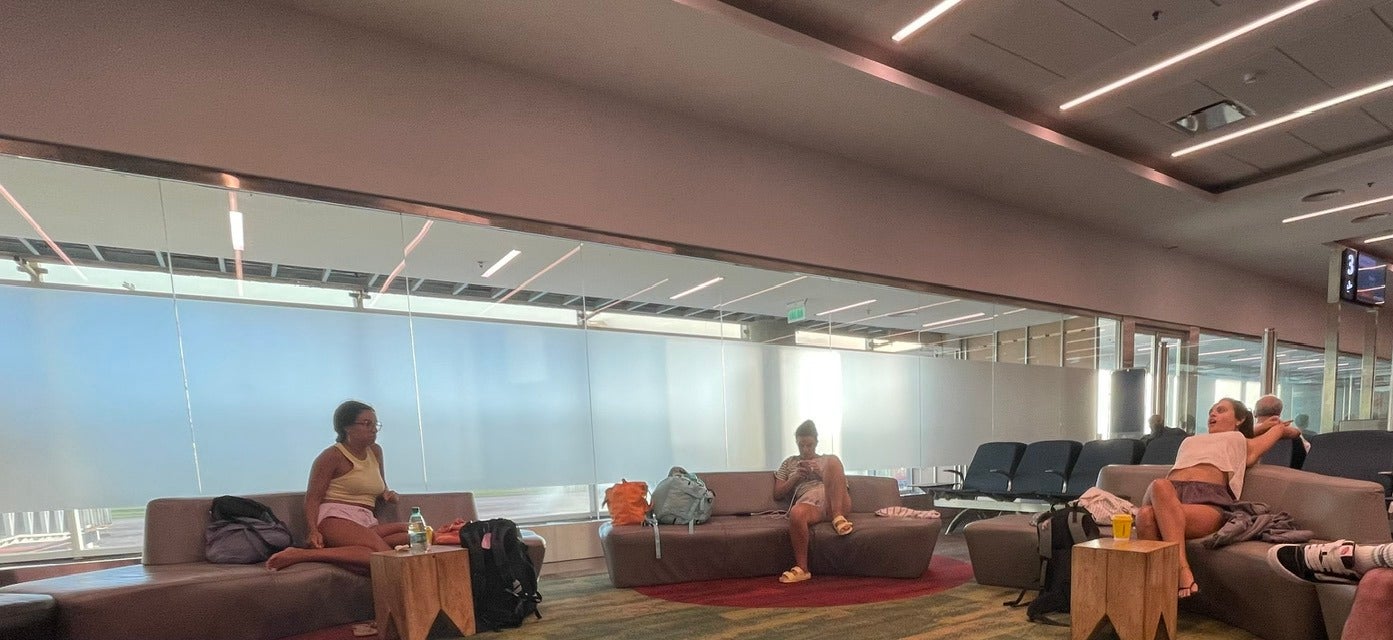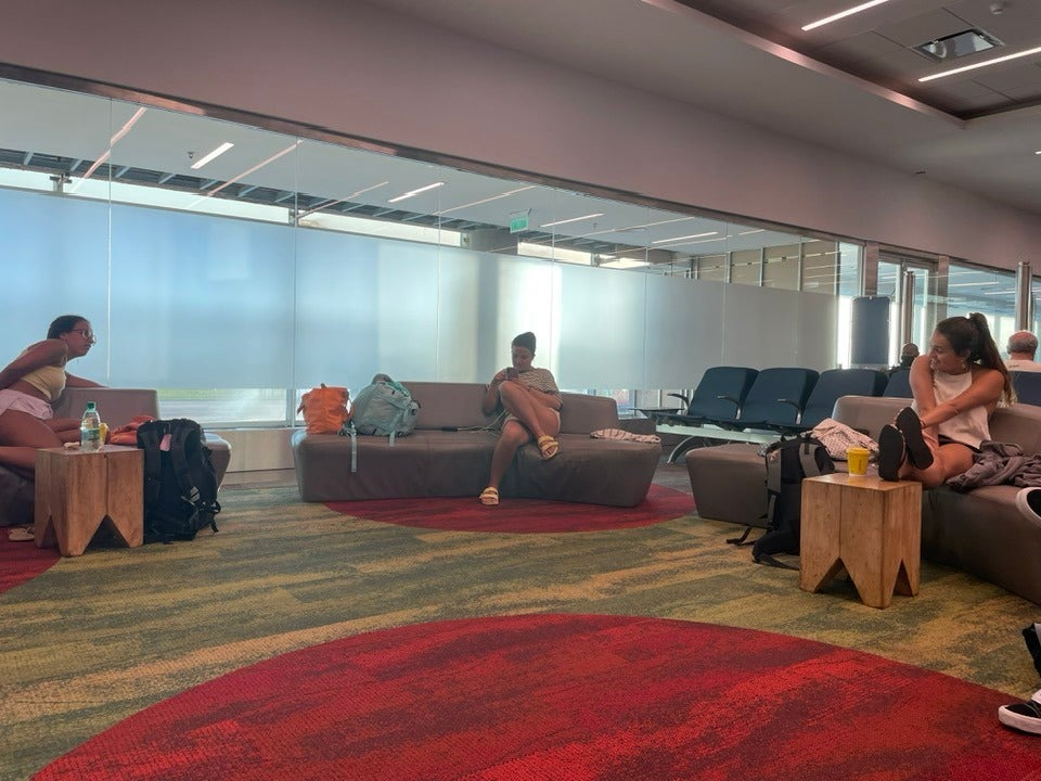 En la zona más apartada hay sillones inmensos para descanso de los viajeros. Allí aterrizaron tres jóvenes pedorras con sus mini shorts intrauterinos y se desparramaron, descalzándose, ocupando CADA UNA UN SOFA DE CUATRO PLAZAS.