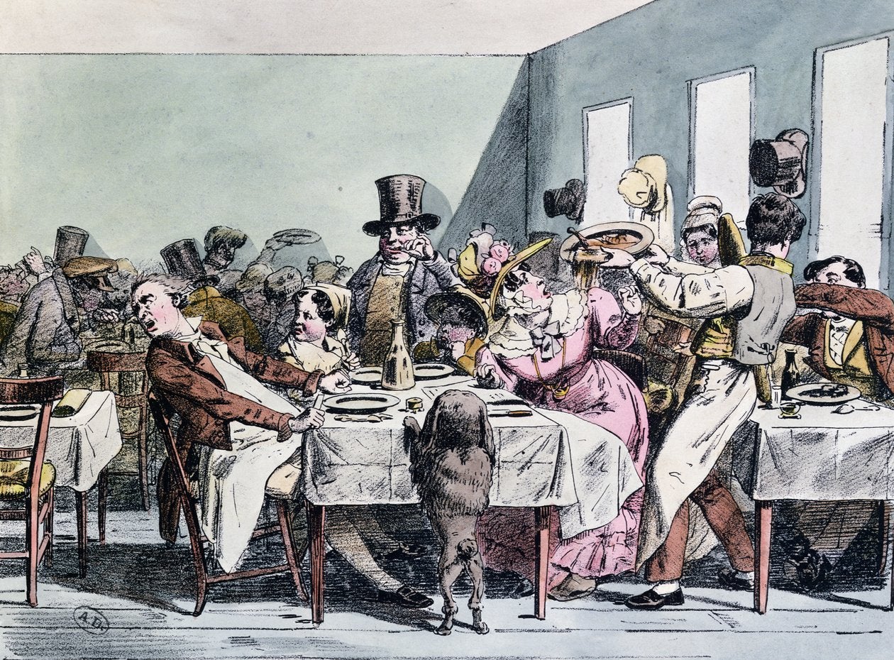 *** Dibujo de “Experiencia encantadora de una familia en un restaurante abarrotado,” c.1860 · Henri Bonaventure Monnier. Bibliotheque des Arts Decoratifs, Paris, France / Bridgeman Images