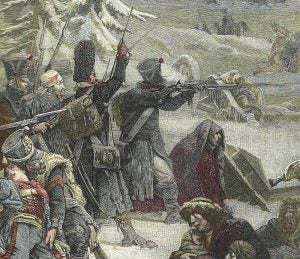 Pero dejemos de lado el continente y sus méritos y vayamos al contenido de ese periódico publicado el 15 de enero de 1894. Lo que vemos en las imágenes que ilustran este artículo son, como he dicho, fragmentos, escenas entresacadas del cuadro que su autor, Adolphe Yvon, tituló “El mariscal Ney en la retirada de Rusia”. Un acontecimiento que, para los que necesiten esta clase de justificaciones, ocurrió en otro invierno, realmente crudo, que tuvo lugar ahora hace exactamente dos siglos.