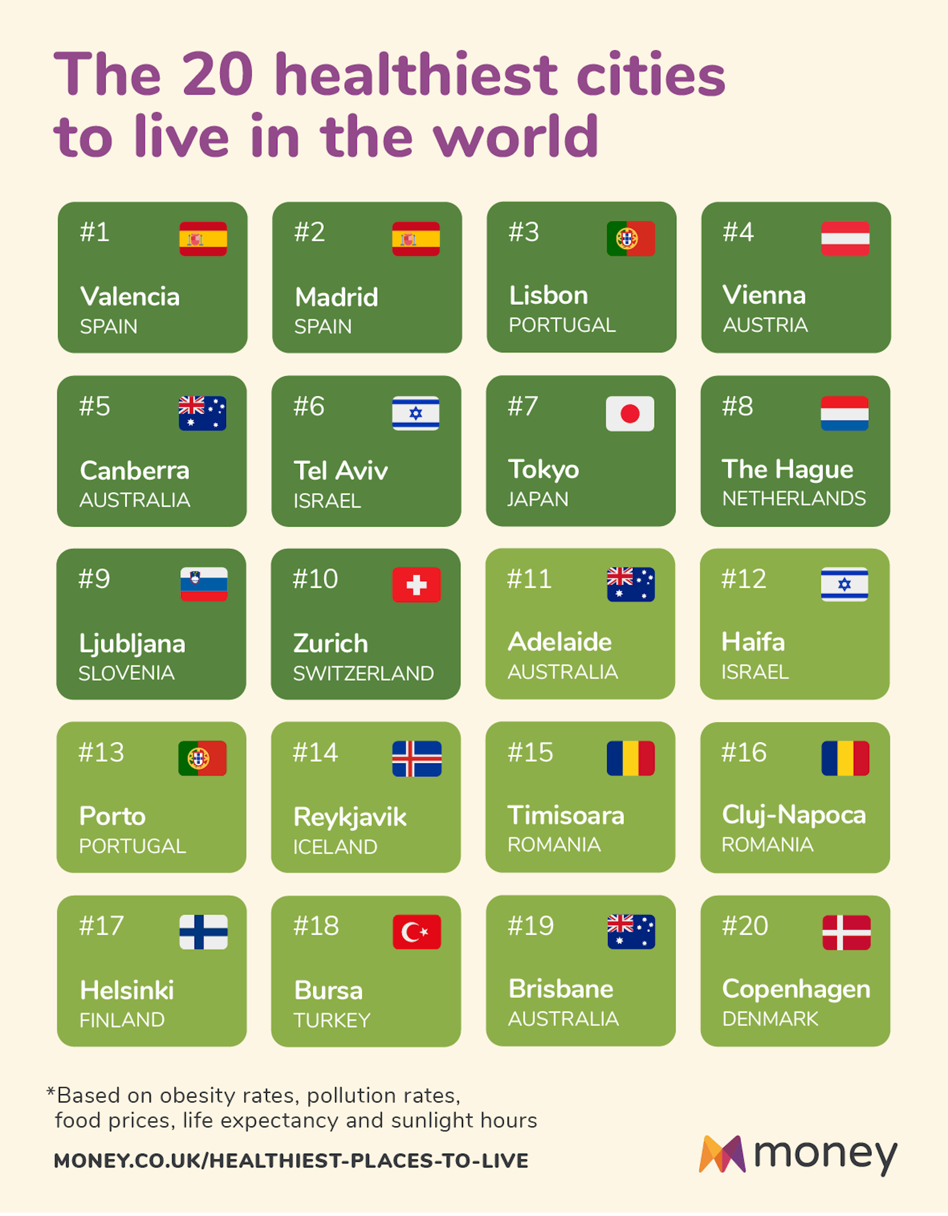 A su vez, el estudio también ofrece el listado de las ciudades más saludables del mundo para vivir. En función de los criterios mencionados con anterioridad, Valencia es la ciudad más saludable del mundo. Valencia tiene un clima ideal. No hace demasiado calor, y cuenta con una humedad razonable, lo que hace que se disponga de mucha vegetación que proporciona aire limpio. La brisa marina también ayuda a eliminar el exceso de contaminación, y además, cuenta con muchas horas de luz, lo que facilita la fácil absorción de vitamina D. Respecto a su dieta, la paella valenciana tiene un excelente valor nutricional, es elaborada a partir de productos frescos, es baja en grasas y alta en omega-3 y proteínas de pescado. Por último, Valencia promueve un estilo de vida tranquilo, relajado, y que fomenta la interacción social, además de ser bien conocida por su herencia musical y cultural (será Capital Mundial del Diseño el año 2022).
