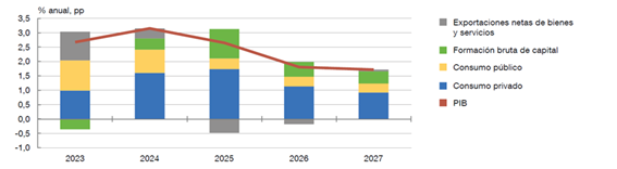 Junto a ello se observa que la aportación de la inversión (formación bruta de capital, en verde) aumenta mucho este año y algo menos los años venideros, lo que es bueno, mientras que la aportación del sector exterior (en gris) pasa a ser negativa en 2025 y 2026, pero se neutraliza los próximos años.