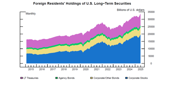 El Gráfico 1 muestra las tenencias de activos financieros estadounidenses a largo plazo por parte de residentes extranjeros. El volumen total actual está cerca de los 35 billones de dólares y casi 20 billones en acciones, cuando en 2015 superaban ligeramente los 5 billones, o menos de 4 billones en 2007 (esto último no se ve en el Gráfico 1).