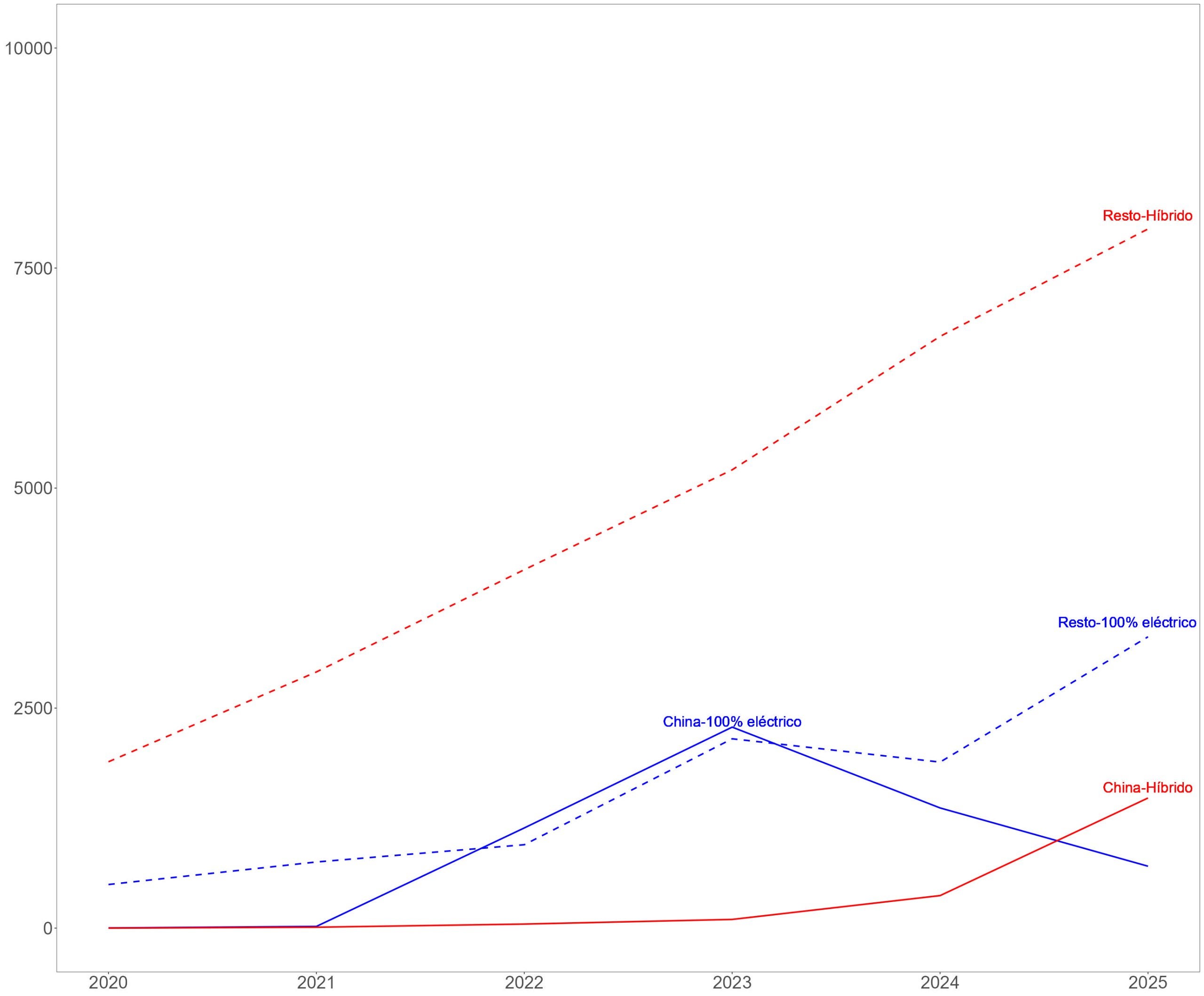 Importaciones de coches 100% eléctricos e híbridos desde China y el resto de los países, 2020-2025 (millones de euros)