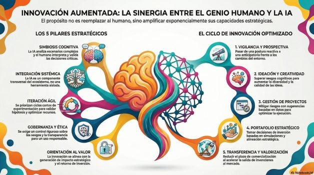 En este contexto emerge el concepto de Innovación Aumentada, un paradigma que trasciende la automatización convencional. Se trata de una evolución estructural en la que la Inteligencia Artificial (IA) avanzada se integra en los procesos cognitivos de la organización, con el propósito de amplificar las capacidades humanas y optimizar la toma de decisiones estratégicas. Su propósito fundamental no es el desplazamiento del capital humano, sino la amplificación estratégica de sus facultades creativas y analíticas.