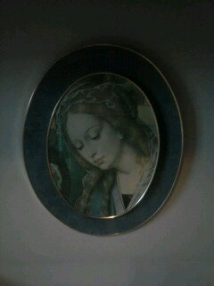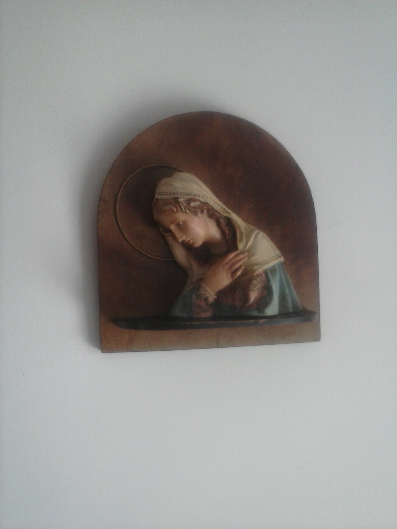 No podía cerrar el post sin enseñaros el buen carma que nos rodea en cada una de las habitaciones. En casa no somos de rezar el rosario cada día, ni de madrugar al son de las campanas para ir a misa. Pero supongo que a mi abuela, que aunque moderna, tiene sus años ya, le seguirá haciendo ilusión que todos nos casemos por la iglesia. Y de la misma manera, se sentirá más “arropada” si estas vírgenes nos vigilan por la noche. Yo estaba dispuesta a retirarlas también, pero viendo la marca de la pared al quitarlas, ¡no se si es peor el remedio que la enfermedad!