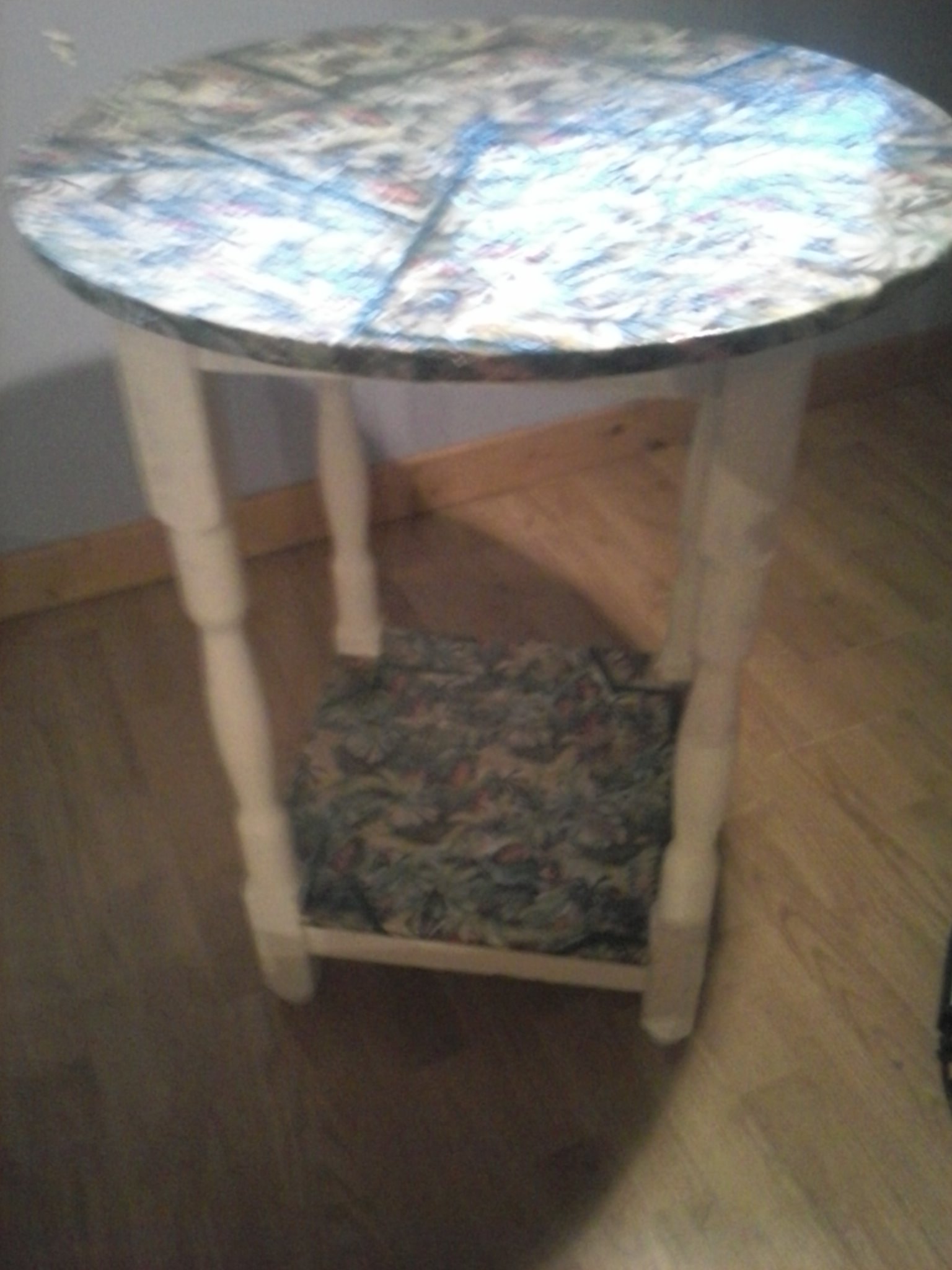 Cómo necesitaba una mesa, estaba canina, y además voy a clases, decidí recoger una en “Emaus”, y tunearla con la “técnica de las servilletas”, o haciendo “Decoupage“, que es lo mismo, pero en francés suena infinitamente mejor.