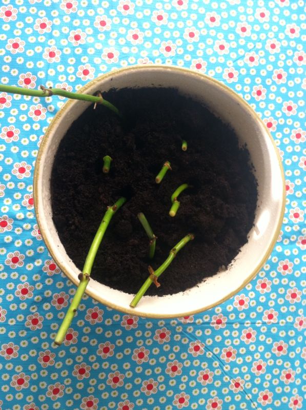 Mi otra abuela, nos ha dejado hace no mucho. Y hoy, en casa de mi madre, he visto una planta, que ha estado presidiendo su salón, desde que tengo memoria, y habíamos subido a un armario, para que los más pequeños de la familia, no se la cargasen a balonazos. Pues bien, he cortado, con permiso materno, unos cuantos rabitos, he comprado tierra, y los he trasplantado en mi tiesto más señorial, que casualmente estaba vació, y esperando.