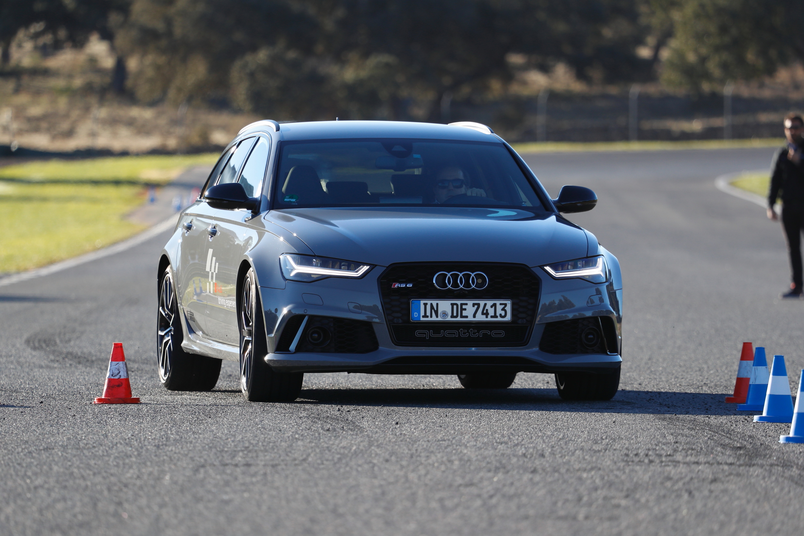 Con el RS6 hemos probado la frenada brusca con conos y pisando el pedal de freno como si no hubiera un mañana. Se trata de comprobar la direccionalidad que te permite el ABS. Es decir, frenar de golpe y direccionar el coche. Una maravilla. Este ejercicio es muy recomendable para todos los conductores porque adquieres confianza y, en un momento de necesidad, te aseguras pisar el freno a tope, sin miedo y con convicción. Es fundamental no mirar el obstáculo que tienes delante…. Si lo miras, te vas a por el. Sin duda. Lo ideal es mirar a lo lejos, a larga distancia para anteponerte a la que te puede venir encima…